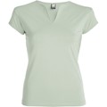 Camiseta entallada de cuello redondo con abertura en V, semi-manga al hombro ribeteada y costuras laterales.